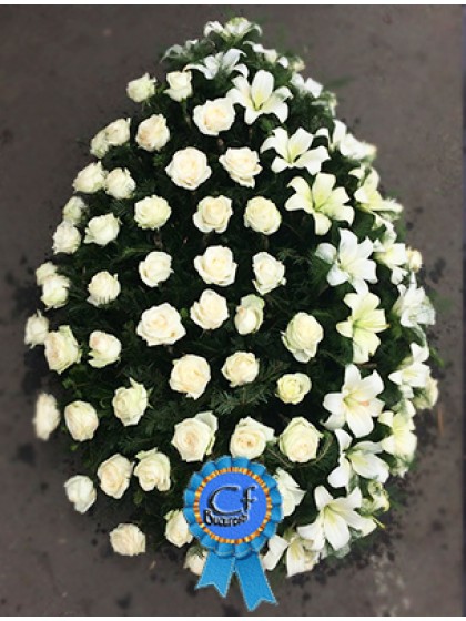 Coroana funerara executata Trandafiri albi si din Crin Imperial alb cu brad natural.